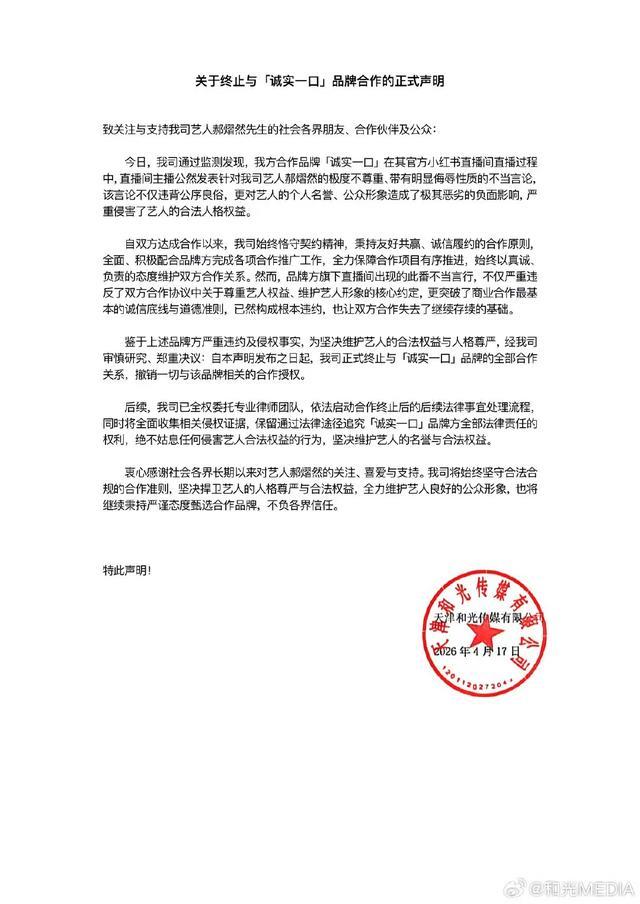 鉴于上述品牌方严重违约及侵权事实,为坚决维护艺人的合法权益与人格尊严,和光传媒自本声明发布之日起,正式终止与诚实一口品牌的全部合作关系,撤销一切与该品牌相关的合作授权。