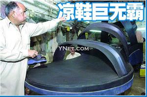 2003年7月1日,巴基斯坦鞋匠穆尔塔扎(左)在他的制鞋作坊里展示一只长达3.93米的巨型女式凉鞋,以世界第一大凉鞋进入吉尼斯纪录。在此之前,这家作坊曾制作过一只高1.9米、宽1米,鞋跟高达60厘米,重200公斤,耗资1724美元的凉鞋,打破了此前由一名印度皮鞋匠保持的吉尼斯世界纪录。
