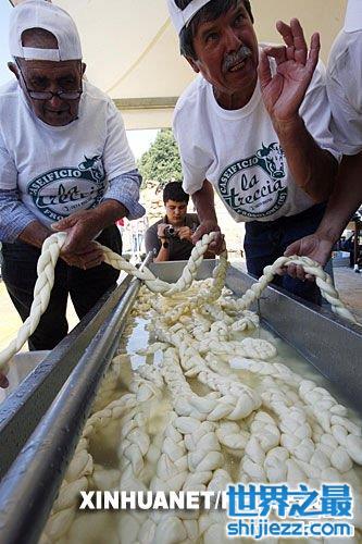 2007年7月29日,在意大利南部小村庄弗罗索洛内,工人们在制作一根783.6米长的意大利干酪。这根意大利干酪属于白色莫兹阿勒奶酪,其长度打破了2006年创下的白色莫兹阿勒奶酪640米长的世界纪录。