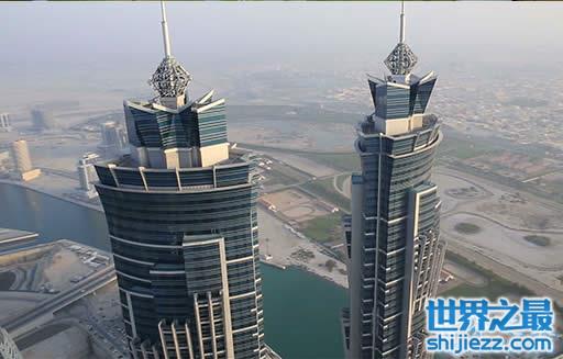 迪拜JW万豪伯爵酒店被吉尼斯世界记录大全认证为世界上最高的酒店,它由一对双子塔组成,每座各有72层,高约355米,1608间客房,酒店外观参照“椰枣树干”设计。在这家酒店71和72层楼上的拱顶酒廊里,人们可以俯瞰迪拜的全景。
