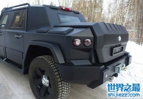 拉脱维亚汽车公司Dartz与俄罗斯Kombat公司联合制造的防弹系列越野车。DartzPrombron车身装甲厚达7cm,可抵御AK47的攻击,自身重量高达4吨,搭载8.0L排量V8增压柴油发动机,最大功率456马力,最大扭矩850牛米,而最高车速高达240km/h。车内采用真皮内饰,配备Rogue Acoustic影音系统及动功能液晶屏,在强悍的性能之余不乏奢华。