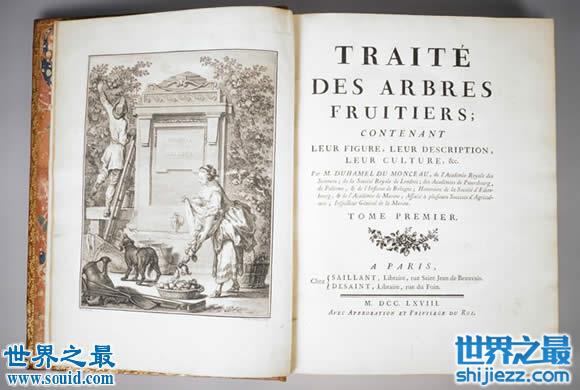 这本书的插图的亨利.路易斯.杜Duhamel Monceau和功能皮埃尔安托万和Pierre Jean Francois Poiteau特平、标题“果树专著”,它由五卷、一份450万年这罕见的书卖了450万美元。这本书插图和信息特性16个不同的水果种类和多个品种、第一卷首先描述和说明不同的修剪和嫁接方法帮助鼓励果树在法国的传播。↓↓↓