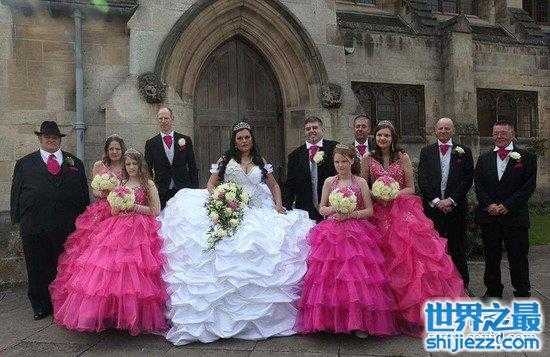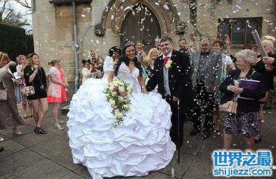 来自英国考文垂的39岁新娘丽贝卡.玛卡姆,上周六身穿127斤重的巨型婚纱,和42岁的未婚夫凯文.史密斯举行了一场盛大的婚礼。