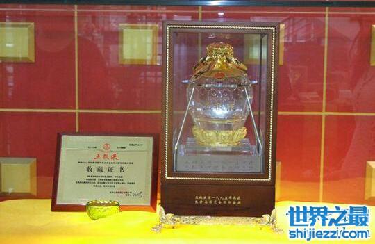 为纪念1915年首次荣获巴拿马国际博览会金奖,五粮液特别推出了九十周年金奖纪念酒。酒体由国家级白酒评委、五粮液首席调酒大师,采用600多年明代窖池中九十年陈酿的老酒精心勾兑而成。酒坛瓶的莲花宝座和盖头全部采用24K千足纯金制作;其中“0009”号纪念酒曾拍卖出88万元的天价。