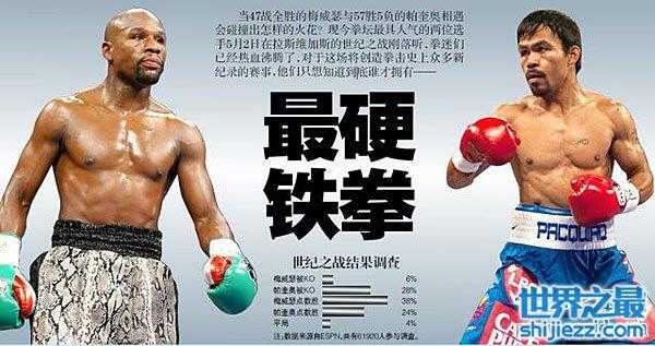 而菲律宾拳手帕奎奥被称为继成吉思汗后征服西方最伟大的东方斗士。不到20岁就赢得WBC次最轻量级世界拳王头衔,22岁获得羽量级拳王金腰带,26岁获得超羽量级冠军,是迄今唯一8个量级的金腰带获得者。由于两人都到了退役的年龄,因此外界都希望两大拳王能在退出拳坛前来次对决,看看谁是真正的拳王。