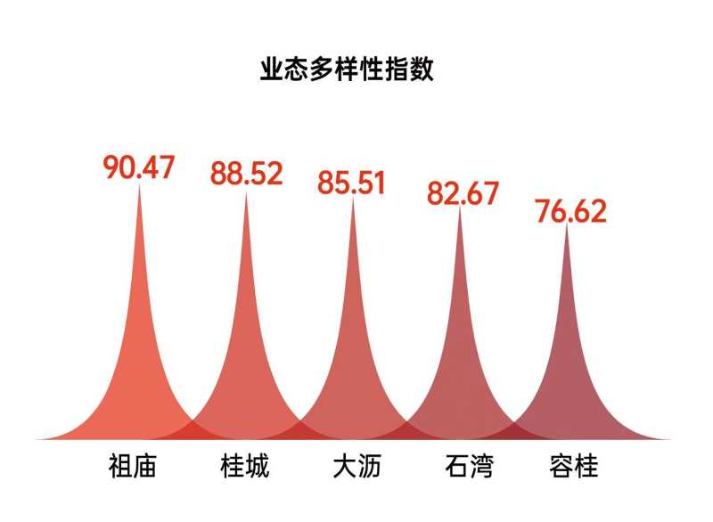 从最终评分来看,上榜镇街仍然可以明显地分成三个梯队:桂城、祖庙得分在90分以上,表明无论在商圈数量、业态丰富度、品牌吸引力、客流热度等指标上表现出色,定位为“城市核心商业区”。