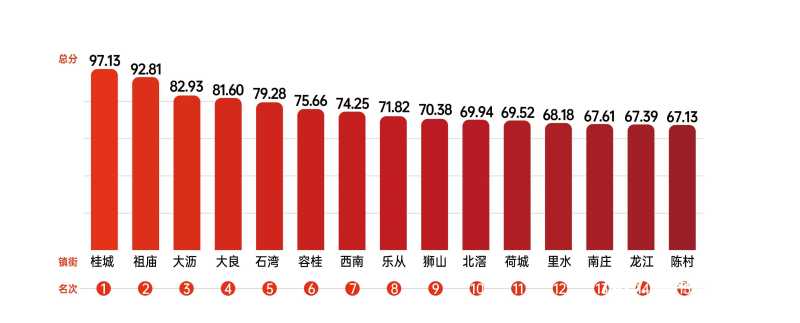 聚焦镇街,他们的商业活力呈现怎样的变化和发展?从上榜“阵容”来看,上榜的15个镇街与去年大致相同,14个镇街“守榜”成功:桂城街道、祖庙街道、大沥镇、大良街道、石湾镇街道继续站稳前五,第6至14名排序同比去年略有调整;陈村镇以0.1分的优势超越西樵上榜。