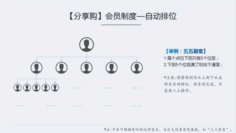 分享购模式采用【公排机制】+【五五滑落】+【九层会员】+【滚动收益】机制