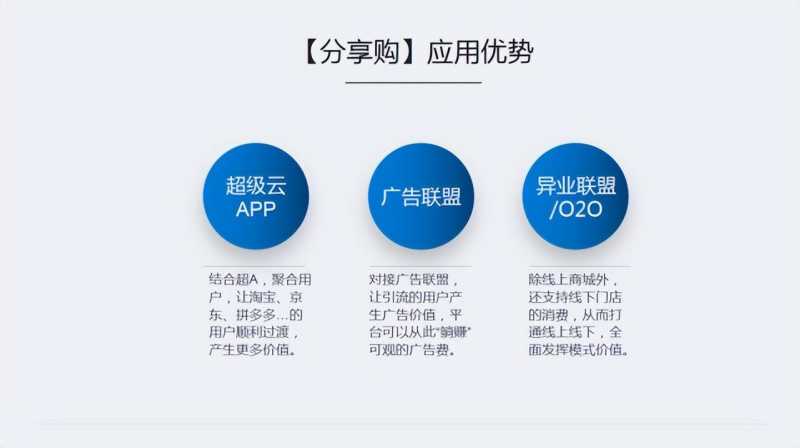 商业模式最具吸引力的当属2022年创新模式——分享购,分享购是一个融合总流量与资源的商业运营模式,完成全部生态布局的应用。融合自营品牌、供应链管理、CPS等优质,可以实现“交易” “共享”的新生态模式。通过跳转到主流电商平台消费,这些主流平台结算佣金给到平台方,平台方再根据平台规则将佣金发放给到用户。