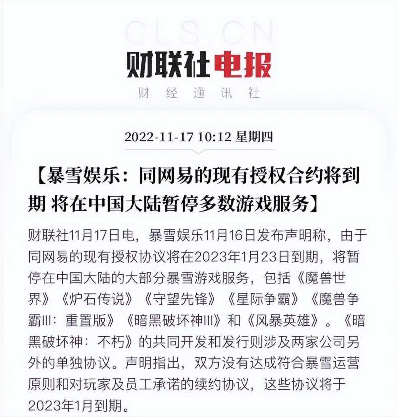 11月17日,暴雪娱乐突然发布了一则新闻通稿表示,由于未能与网易达成续约协议,根据现有的授权条款,将于2023年1月23日在中国大陆暂停提供包括魔兽世界、炉石传说、守望先锋、星际争霸等暴雪游戏服务。