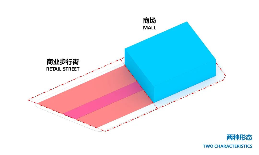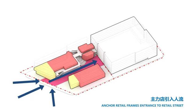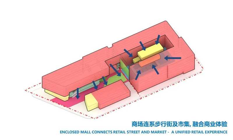 项目的空间布局模糊了两种传统商业空间:商业步行街和商场之间的界限,使两者在空间上互相融合渗透。商场中庭设置三个灵感源自集装箱快餐车的漂浮盒子,形成极具特色的空间体验。