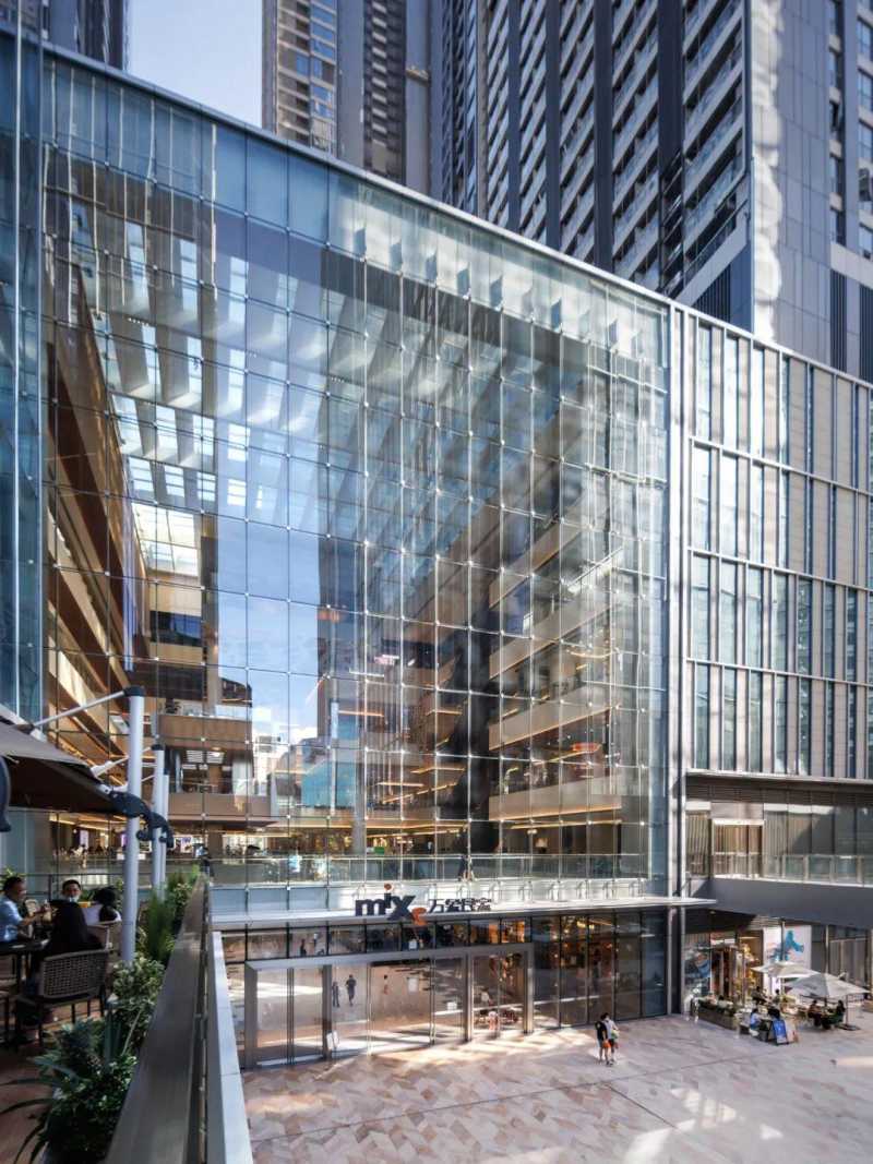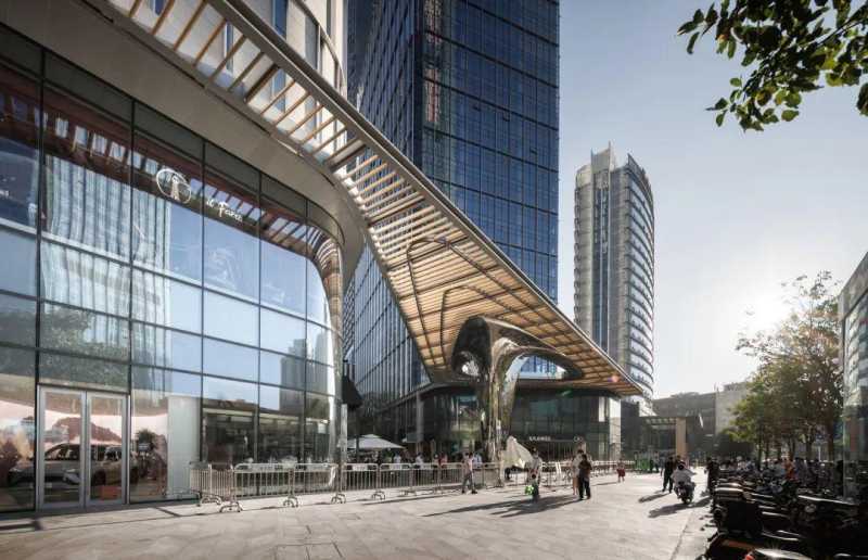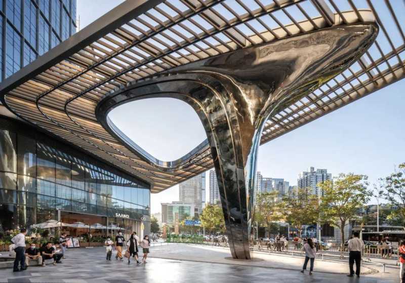 两座大型办公塔楼分别布置在主入口商业街的两侧,于是雕塑型顶篷营造了平宜近人而舒适的平衡。镜面的金属表皮具高反射性,无论是阳光灿烂的日间或是霓虹闪烁的夜晚,都为项目所在街区增添不少活力。