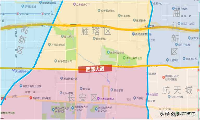 众所周知,西部大道作为城南3.5环人居核心住区,东邻航天城、南邻长安国际大学城、西邻高新三期、北接雁塔电子城板块,是当下西安主城区屈指可数的成熟可开发板块。