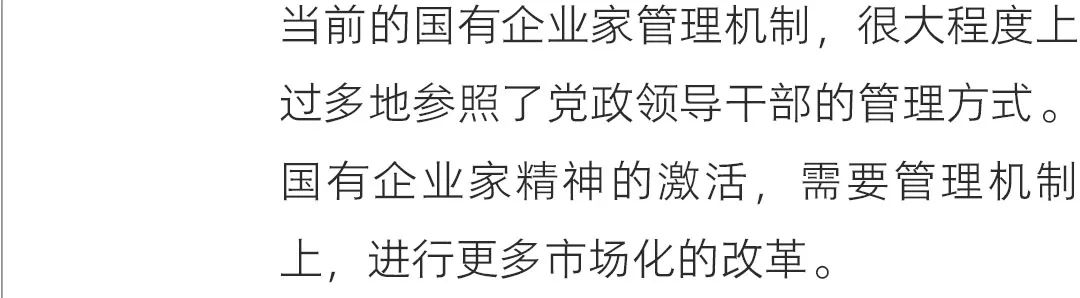 在股权激励方面,其实这轮国企改革已经推出了一些列中长期激措施。按照改革要求,国有企业家需要放弃所谓“干部”编制,与企业签订劳动合同,并且自掏腰包几百万甚至上千万认购股份,与企业实现“深度捆绑”。然后,通过混改、上市,不少过国有企业家已经实现“财务自由”。这项改革的激励效果值得肯定,今后应该提质扩面。