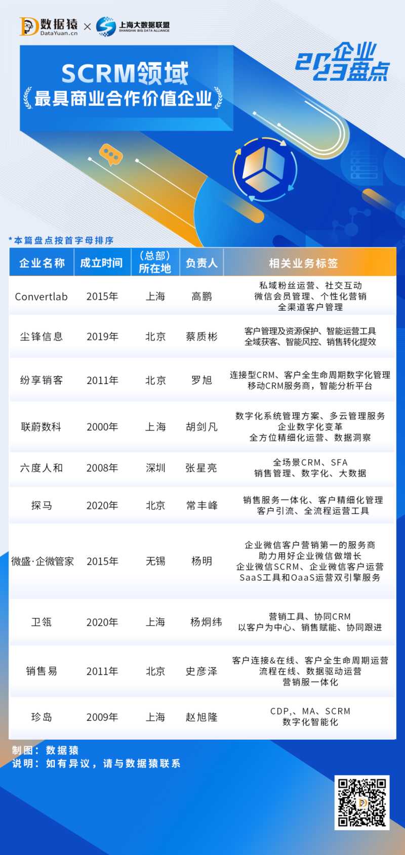 对此,在历经数月的时间里,由数据猿内部员工组成的初审小组、核心粉丝群组成的公审团,以及外部行业专家成员组成的终审团,通过直接申报交流、访谈调研、外界咨询评价、匿名访问等交叉验证的层层筛选推荐机制下,最终制作形成了《2023中国SCRM领域最具商业合作价值企业盘点》