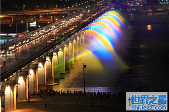 半坡大桥喷泉位于韩国,它就建在一条长长的大桥的旁边,共设有300多个喷泉。与其它的喷泉不同的是,泉水从桥面上喷向河面中,形成拱形然后放眼望去有七彩的光,就好像美丽的彩虹重叠在一起,给这个城市傍晚添加了美丽的色彩,也照亮了这座桥。