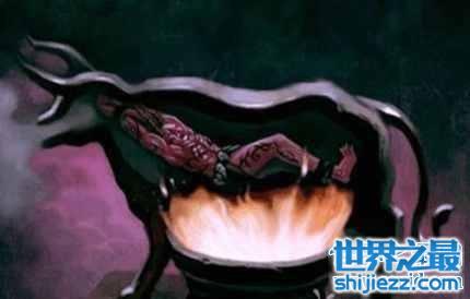 铜牛是古希腊时期的一种刑具,当然在武则天时期也曾发明过这种特殊的刑罚,这种铜牛身体部位是中空的,只有牛的鼻子有一个通气孔,而且下面置有燃料,犯人被放入铜牛内部后,燃料便开始加热铜牛,随着铜牛温度增高,里面的人开始吼叫,而且牛鼻子还会有热气出来,直到犯人死亡,这过程真的是惨不忍睹。