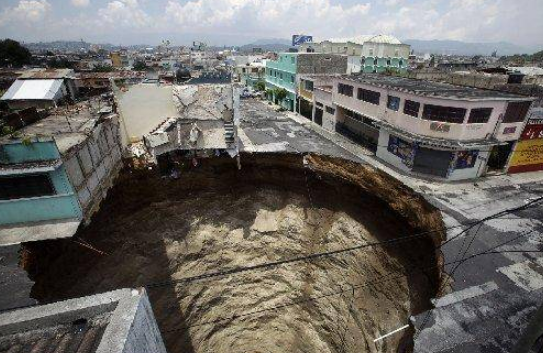 天坑(sinkhole)是指由于水不断侵蚀固体基岩,使地表发生塌陷形成的一个巨大的深坑,目前在世界上发现确认的天坑有80多个,以下是世界上最著名的十大天坑。图为2010年5月底,或因受热带风暴的影响,南美危地马拉出现了一个巨大骇人的深坑。由于“阿加莎”肆虐的影响,危地马拉首都危地马拉城一处出现地面下陷,形成一个深60米、直径30米的地洞,据说有一栋3层楼建筑坠入这个坑里。