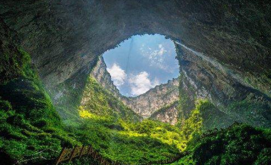 图为重庆小寨天坑位于奉节县的荆竹乡小寨村境内,这是世界上规模最大最深的天坑,重庆小寨天坑的坑口直径为622米,坑底直径为522米。天坑深度为666.2米。站在坑口往下看,四面一削千丈的绝壁直插地下,深不见底,令人目眩。站在坑底抬头仰视,蓝天白云从洞口飞速掠过,颇有“坐井观天”之感。游客在去往天坑底部的途中,还能欣赏到天坑内部所形成的特殊生态景观,坡地上草木丛生,野花烂漫。