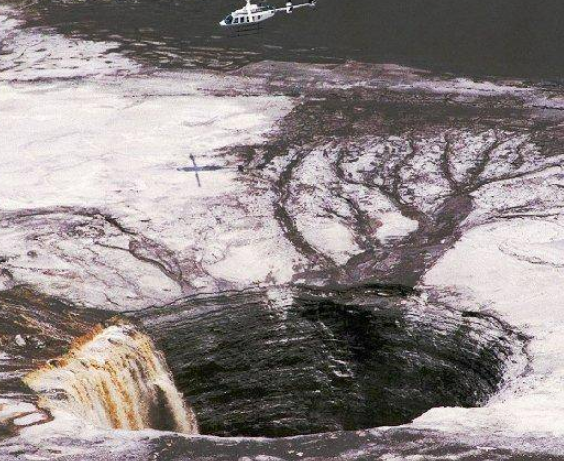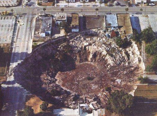 图为佛罗里达州的马尔伯里市出现了一个深约56米的天坑。这个天坑的出现是因为采矿企业IMC-Agrico开采岩石所致。该公司开采岩石为的是提取磷酸盐,磷酸盐提取出来后,留下石膏等废料,倾倒在路边,随着一层层的石膏被晒干,就形成了裂缝,后来,水在裂缝中不断流动,将地下物质冲走,废料堆旁的地面塌陷,出现了天坑。