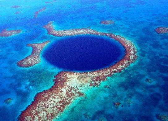 图为伯利兹海面上有很多蓝洞,但是邻近灯塔礁(Lighthouse Reef)的大蓝洞是最著名的一个,也是最适合潜水的地方。蓝洞在伯利兹城外大约60英里(100公里)处,其形状为几乎完美的圆形,直径超过1000英尺(305米),深达400英尺(123米)。
