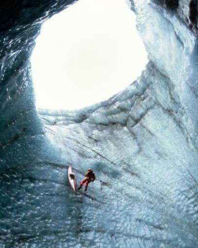 图为冰岛陷坑险家米克?科伊纳和他的皮划艇沿着冰岛第二长河――乔库尔萨河上游一个陷坑的坑壁下降。乔库尔萨河的河水来自一条冰川的融水,这个深150英尺(约合45米)的倒扣漏斗形陷坑由下方地热喷口喷出的上升蒸汽所致。