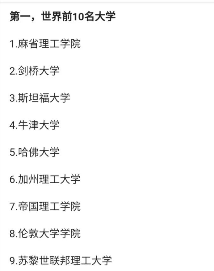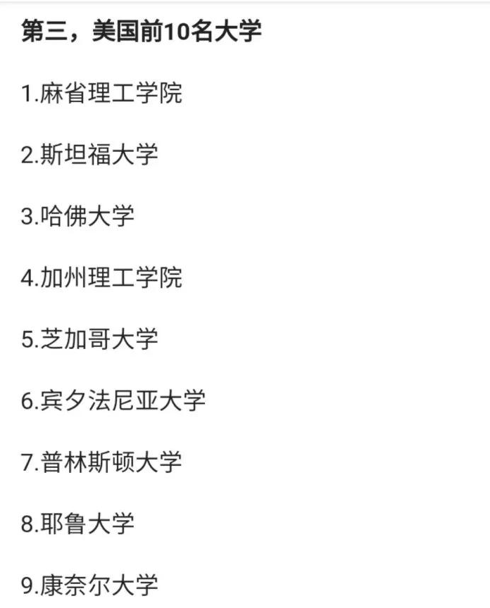 2022年美国大学前十名分别是:麻省理工学院、斯坦福大学、哈佛大学、加州理工学院、芝加哥大学、普林斯顿大学、耶鲁大学、哥伦比亚大学、宾夕法尼亚大学和康奈尔大学。