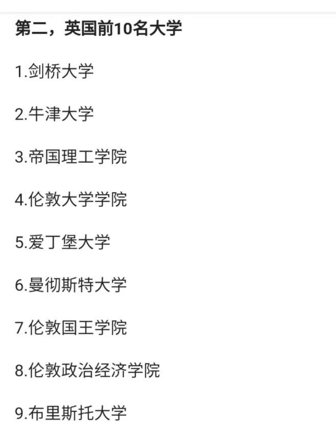 2022年英国大学前十名分别是:牛津大学、剑桥大学、伦敦大学学院、伦敦经济学院、帝国理工学院、爱丁堡大学、曼彻斯特大学、布里斯托大学、格拉斯哥大学和国王学院伦敦。