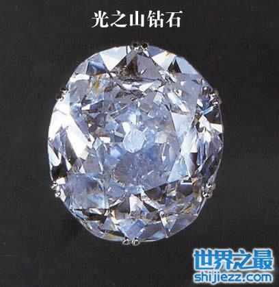 光明之山,产于印度可拉矿山,原石据说重达800克拉。最初磨成玫瑰型,重191克拉。1526年曾归苏丹巴卑尔所有。1738年又成为波斯王纳狄尔沙赫的战利品。1850年归英国王室所有。1862年为除去上面的瑕疵,将其重新琢磨成圆钻型,重量减至105.6克拉。这颗钻石曾引起印度政府与英国王室发生纷争,其历史可以追溯到十四世纪。