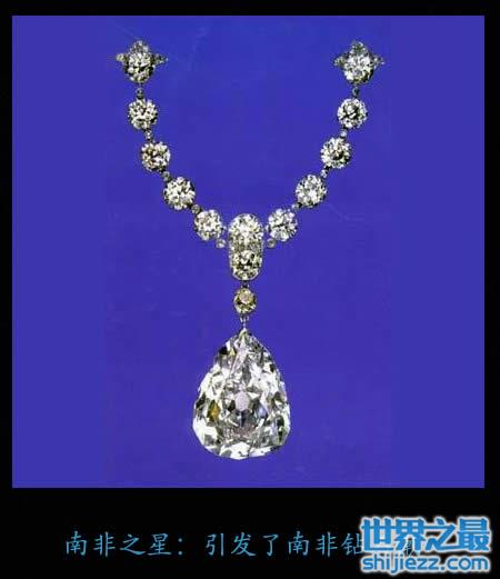 南非之星发现于1869年,原石重83.50克拉,是一个牧羊男孩在路上捡到的。当时他只觉着好看,相信定有人喜欢,本想用这块石头能换来一个睡觉的地方或一顿早点,可却历遭拒绝。后来他找到了修克,据说他是最早认出优瑞佳钻石的那个作客人。当修克看到这块石头,便立刻确信为钻石,眼珠都快掉出来了(这颗钻石约比优瑞佳大4倍)。便把自己的全部家产——一辆篷车、10头牛和500只肥羊全部给了牧童,换来了那块石头。这虽是一次赌博,但他赢了。他以11200英镑将其卖出,之后被陈列在南非国会大厦。殖民地大臣们预言:“各位,这颗钻石将是未来南非的基石”。
