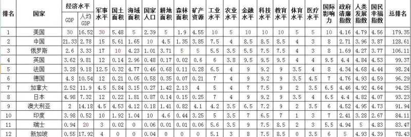 据榜单所示,美国位居榜首,其综合实力高居全球之冠。作为全球最大的经济体,美国不仅拥有完善的金融体系,还在科技和文化领域处于领先地位。其强大的军事力量更是为其在国际事务中的发声权提供了坚实支持。美国之所以能够跻身世界强国之林,正是因为其全面而深入的实力表现。