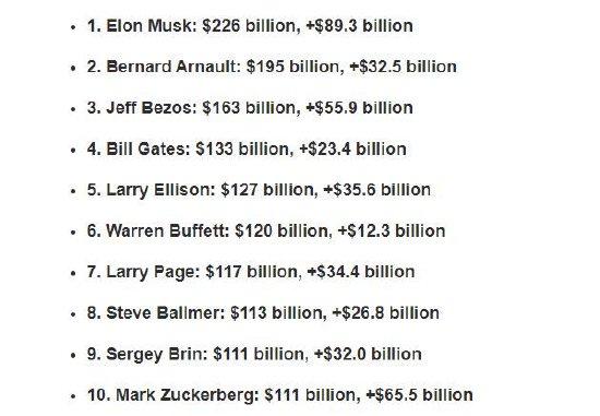 今年迄今,十大富豪的总财富增加了4077亿美元,超过了腾讯、万事达卡集团、宝洁和三星的市值。