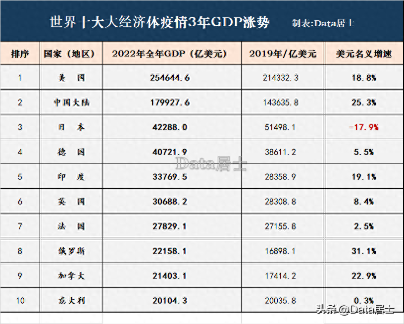 在疫情中各国经济都承受了严峻的考验,而且其中还有汇率的大波动,那么经过3年后十大经济体的GDP格局发生了什么变化呢?从中能看出各国经济韧劲或活力吗?