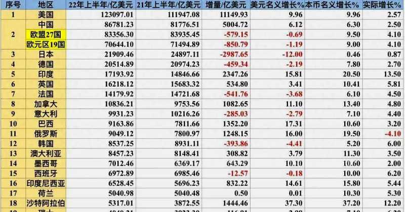 从全球经济的角度来看,俄罗斯、墨西哥、西班牙和印度尼西亚等国也未能跻身前十,这显示了全球经济格局的动荡和变化。要理解这一变化,我们需要根据上半年的GDP总量来重新排列这十大国家,按照GDP从高到低的次序分别是美国、中国、日本、德国、印度、英国、法国、加拿大、意大利以及巴西。这些数据以美元为计价单位,呈现出各国的经济实力。