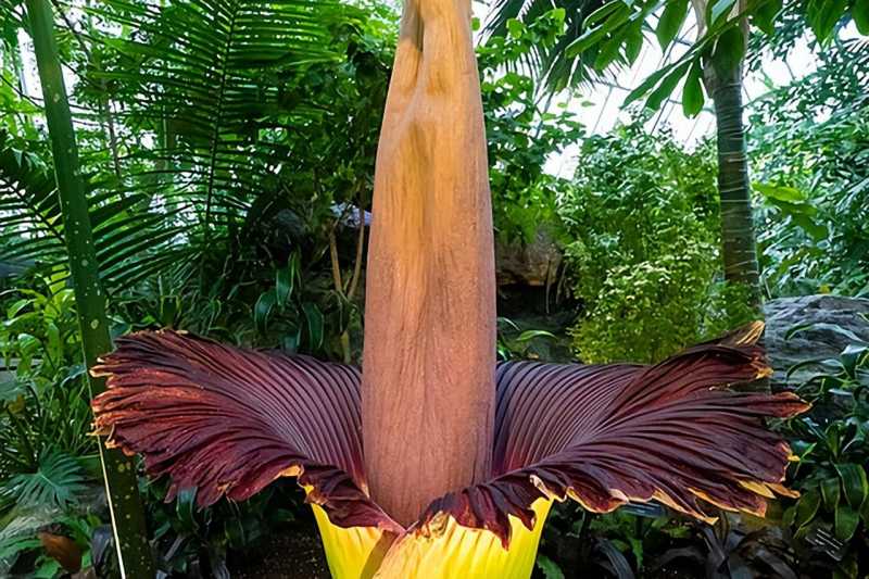 巨魔芋,别名“尸花"、“尸臭魔芋”、“泰坦魔芋”,天南星科、魔芋属植物,其在开花的时候会散发一股类似尸臭的味道,故又被称作“世界上最臭的花”。巨魔芋块茎直径可达65厘米,最重可超过100千克;其叶柄通常高3-4米,叶片直径超过5米,覆盖面积超过20平方米。野生的巨魔芋只生长在印尼苏门答腊的热带雨林里,一生只开两三次花,且开花时间很短,顶多数日,长出果实后很快就会枯萎。