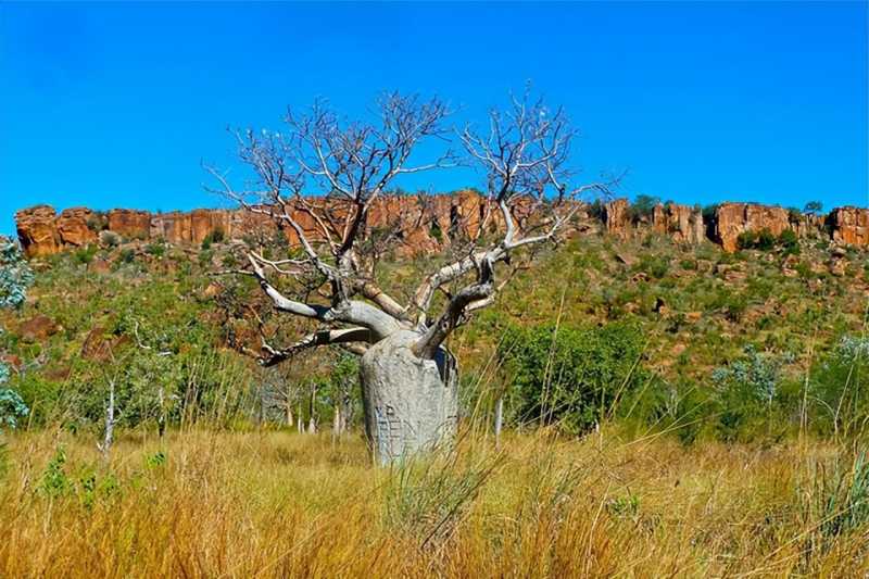 瓶子树,别名也叫酒瓶树、佛肚树、萝卜树,为锦葵科、纺锤树属、瓶子树种植物。瓶子树顾名思义,它的形状就像一个瓶子一样,而且肚子里可以存储很多水,其树高可达18-25米,树干两头尖细,中间膨大,最粗的地方直径可达5米,里面贮水约有2吨。瓶子树和旅人蕉一样,可以为荒漠上的旅行者提供水源,人们只要在树上挖个小孔,清新解渴的“饮料”便可源源不断地流出来,解决人们在茫茫沙海中缺水之急。