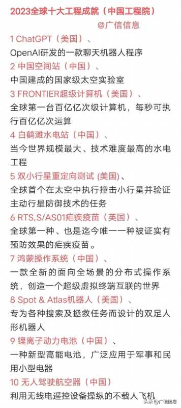 2023 全球十大工程成就,中美是主角,中国5项,美国4项,英国1项。