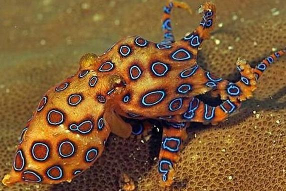 蓝环章鱼是一种小型章鱼,生活在澳大利亚和菲律宾海域。它们的身体非常鲜艳,具有明显的蓝色圆环图案。蓝环章鱼的毒性非常强,它们体内含有大量的毒素,能够导致人类出现严重的神经中毒症状。被刺伤后,毒素会迅速传播到全身,导致剧痛、呼吸困难、心跳加速等症状,甚至可能致命。