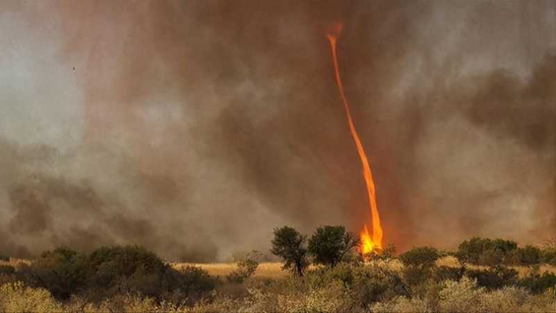 旋风与野火遭遇就会形成灾难性的“火旋风”。炽热的火舌和周围冷空气之间形成的巨大温度梯度可以形成旋涡。在气流和风适宜的情况下,旋转的火苗直插入天空。火旋风可能在天空中延伸数百英尺,把树木连根拔起,造成人员死亡。1923年,日本发生的火旋风曾在几分钟之内造成38000人死亡。