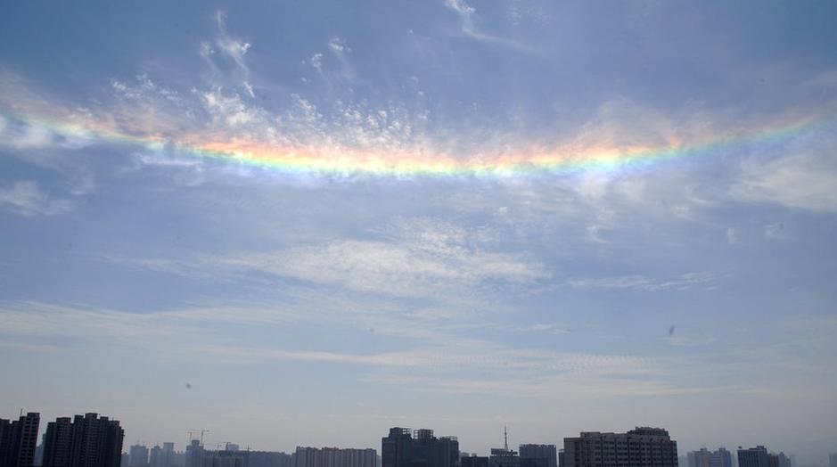 这种倒挂的彩虹也叫环天顶弧。彩虹是可见光谱经过水滴后折射形成的。而这种倒挂彩虹是光线照在冰晶如某类云中所含冰晶的上方,然后经过冰晶边缘折射形成。环天顶弧与椋平虹现象非常一致,由于“椋平虹”的出现与“地震”有着一定的联系,所以看到“环天顶弧”就容易让人联想到地震。