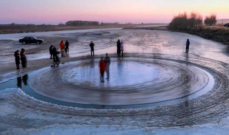 不光麦田有奇特怪圈,冬天也有自己的神秘现象:漂亮的正圆形冰圈在水中缓慢旋转。暂且不提遇到外星人的笑话,但是有关这一奇景还流传着几种不同的理论。最流行的说法是河水缓慢流动会旋成一块圆形的冰,然后随着冰块缓慢旋转,边角相互摩擦,最终形成一个正圆形。这个直径为6英尺(约1.8米)的旋转冰圈是2008年在加拿大发现的。