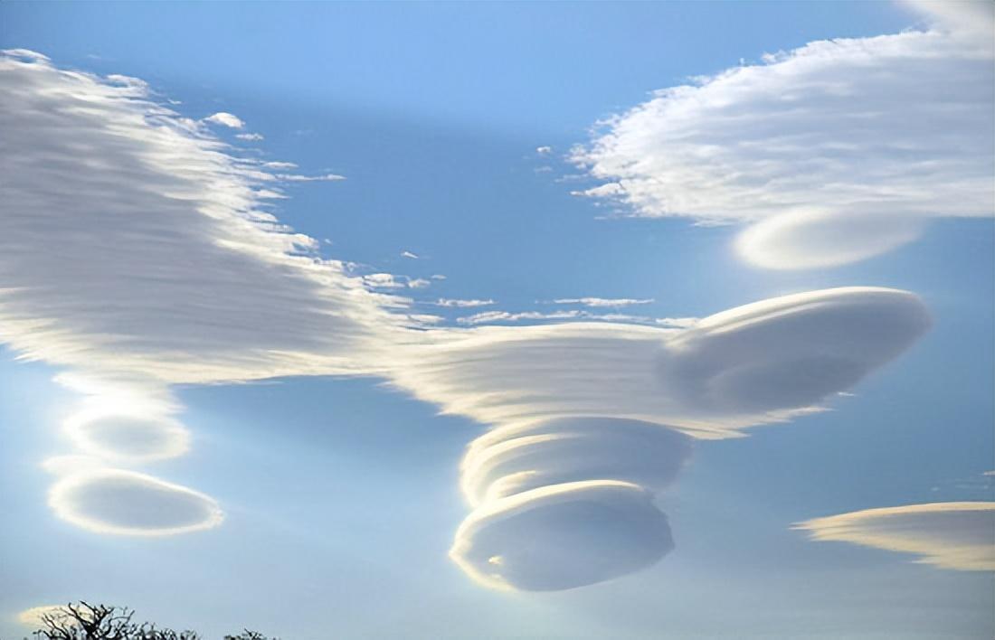 这是罕见的荚状云,是气流在山脉中流动时形成的波浪状云。有些人把这种看起来扁平而椭圆形的云误当成是不明飞行物。这图中的荚状云是2008年9月在新墨西哥西南部拍摄的。荚状云,又称飞碟云,状如飞碟,常被误认为外星飞船或不明飞行物。它是一种自然天气现象,经常在湿润空气经过山脉上空时出现。如果空气在经过山脉上空时温度下降,空气中的水分就会凝结成荚状云。
