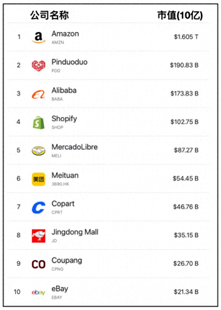 世界10大电子商务公司(按市值排行)