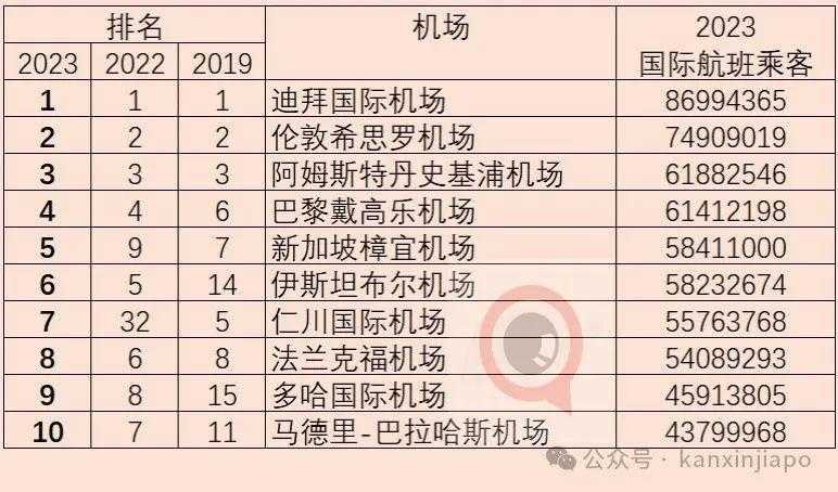 2023年,新加坡樟宜机场的国际航班乘客为5841万人次,与2022年相比增长了83.1%,排名也往前晋升了4个位置来到第五位。