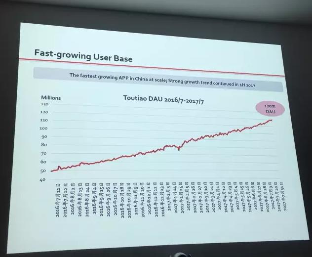 从2016年7月到2017年7月,今日头条的日活跃人数从5000万人猛增到1.2亿人。