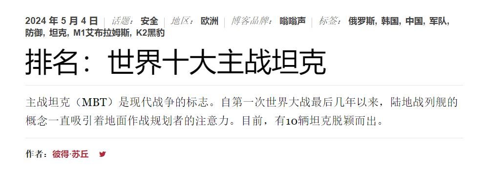 鉴于不少主战坦克都已经在乌克兰战场上经过了实战检验,西方现在也开始重新排出全球十大主战坦克,并且这次的标准不再只考虑单车性能,而是综合考虑坦克的火力、生存能力、机动性、可靠性以及生产复杂程度。5月4日,美国《国家利益》网站从上述几个标准入手,对全球十大主战坦克进行了排名。