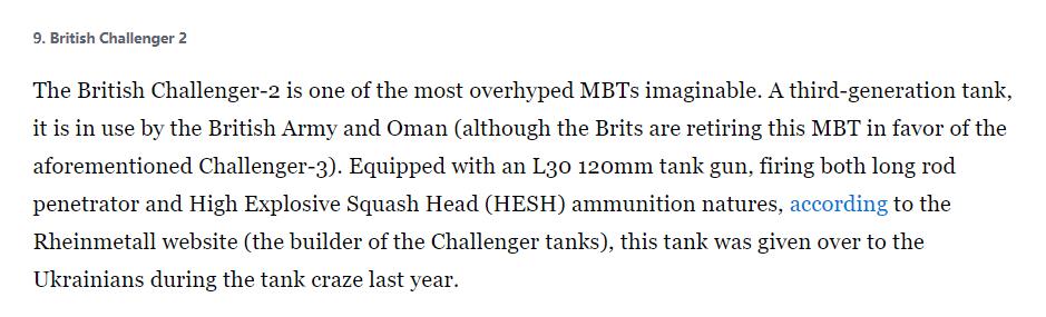 改进型的挑战者3的排名竟然落后于挑战者2,足以说明英国的改进有多么失败。只不过挑战者2同样问题多多。虽然挑战者伊拉克战争期间有出色表现,但那都是建立在拥有绝对空中优势,并且屠杀对手老式坦克的基础上。