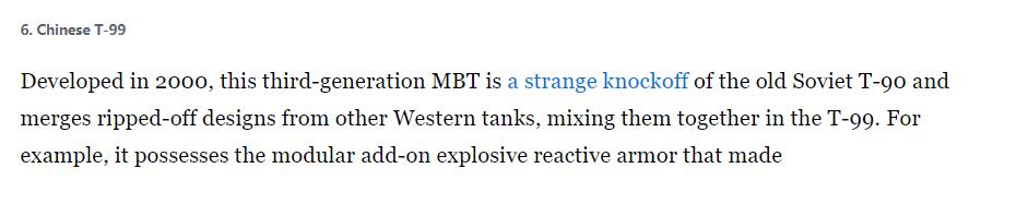 好消息是中国的99A坦克排名首次超越德国的豹2,坏消息是99A的排名依然未杀进前5。当然,这其中免不了西方戴着有色眼镜评判中国武器的因素在内。比如美国媒体就认为99A坦克是T-90的仿制品,并抄袭了西方坦克的设计。