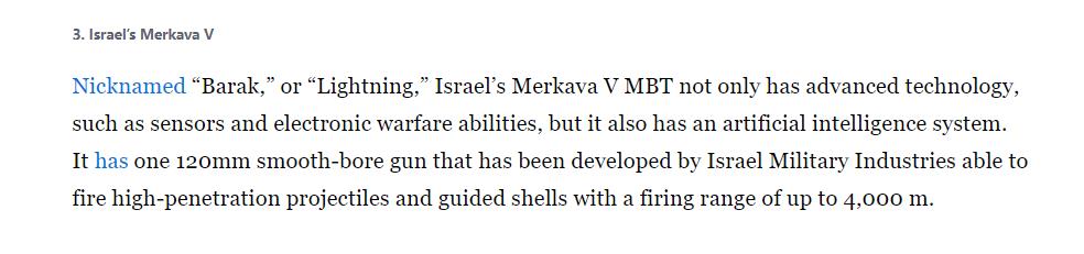 过去的梅卡瓦主战坦克被军迷讥讽为最强步兵战车,但是最新的梅卡瓦5坦克,云集了许多最新的技术,让这款坦克的作战性能大幅提高。相比梅卡瓦4坦克,梅卡瓦5大幅提升了火控系统的信息化水平以及对周边战场环境的态势感知能力,比如在炮塔以及车体的不同部位上安装多个高清摄像头,令车长能够随时观察360度全方位的敌情。高性能云台式光电观瞄系统的应用,让梅卡瓦5坦克具备了对空观测能力,能够及时发现无人机等空中目标。再配合“战利品”主动防御系统,令梅卡瓦5坦克的战场生存能力大幅提高。
