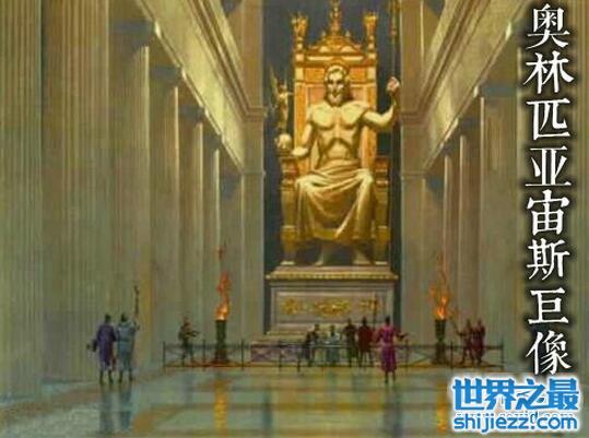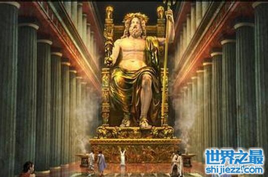 宙斯神像:至于神殿主角——宙斯,采用了所谓的「克里斯里凡亭」(chryselephantine)技术,是在木制支架外加象牙雕成的肌肉和金质的衣饰。宝座也是木底包金,嵌着乌木、宝石和玻璃,是世界八大奇迹中历时八年之久才完成。
